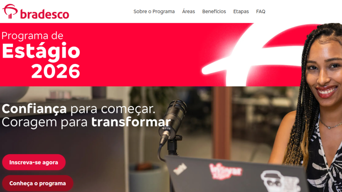 As inscrições para o Programa de Estágio Bradesco 2026 estão abertas até o dia 7 de abril, e devem ser realizadas pela internet, por meio da plataforma Eureca, e a participação é gratuita.