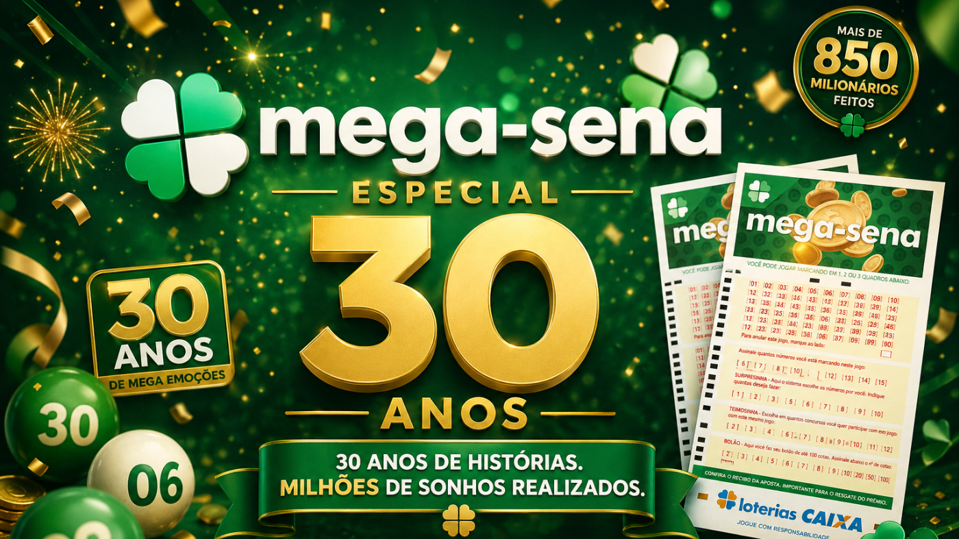 A Caixa Econômica Federal iniciou as vendas para o concurso especial Mega-Sena 30 Anos, que terá prêmio estimado em R$ 150 milhões. A edição comemorativa celebra as três décadas da Mega-Sena e terá sorteio único no dia 24 de maio de 2026.